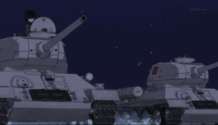 As Ooarai escapes, Nonna takes out the Pz. 38(t) and, together with Katyusha, leads the charge in pursuit of the fleeing Ooarai forces. Mako's attempt to escape under cover of darkness is countered when Pravda uses tracer shells to light up the night sky. However, Anglerfish Team and Hippo Team move aside behind the cover of a ridge crest and let Prada's force go past, then double back to the town to attack Pravda's flag tank.