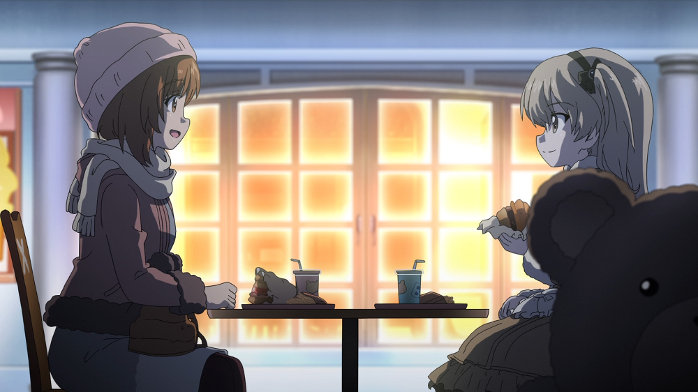 There is still some free time to burn before the Ooarai school ship departs. Mallard team is on attendance duty. Anteater Team plays videogames. Shark Team goes fishing whilst the Rabbit Team observe critically. Turtle Team visit a Zaza Coffee. Leopon team checks out a car on sale. Anglerfish Team go out for crepes, with the exception of Miho, who has gone to the Boko Museum with Alice. After enjoying several themed rides, at dinner together Miho asks Alice if she has already chosen a school. Alice hasn't picked one yet, though she expresses her desire for a re-match with Miho when she does.