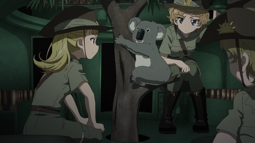 Soon afterwards, Chi-Ha-Tan enter battle with Koala Forest. Inside an AC Sentinel Koala's vice commander, Wallaby, listens to her commander, who is an actual koala. The commander advises them of Chi-Ha-Tan's immemorial frontal charging strategy, and suggests that Koala Forest find an advantageous place from which to ambush them. With Koala Forest's tanks thus deployed, they soon spot Chi-Ha-Tan tanks charging towards them. As the Chi-Ha-Tan tanks disappear in a shallow dip, the Koala Forest gunners prepare a salvo for when they crest the ridge. No targets reappear, however, leaving the Koala Forest students with nothing but a suspicious silence.