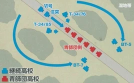 The battle between Blue Division High School (bracket number 15) and Jatkosota High School (bracket number 16) was a match in the first round of the 63ʳᵈ National High School Sensha-dō Tournament. The match grounds comprised of wetlands, snowy fields, lakes and villages. A single path split the battlefield running from East to West. The match ended in a victory for Jatkosota High School.