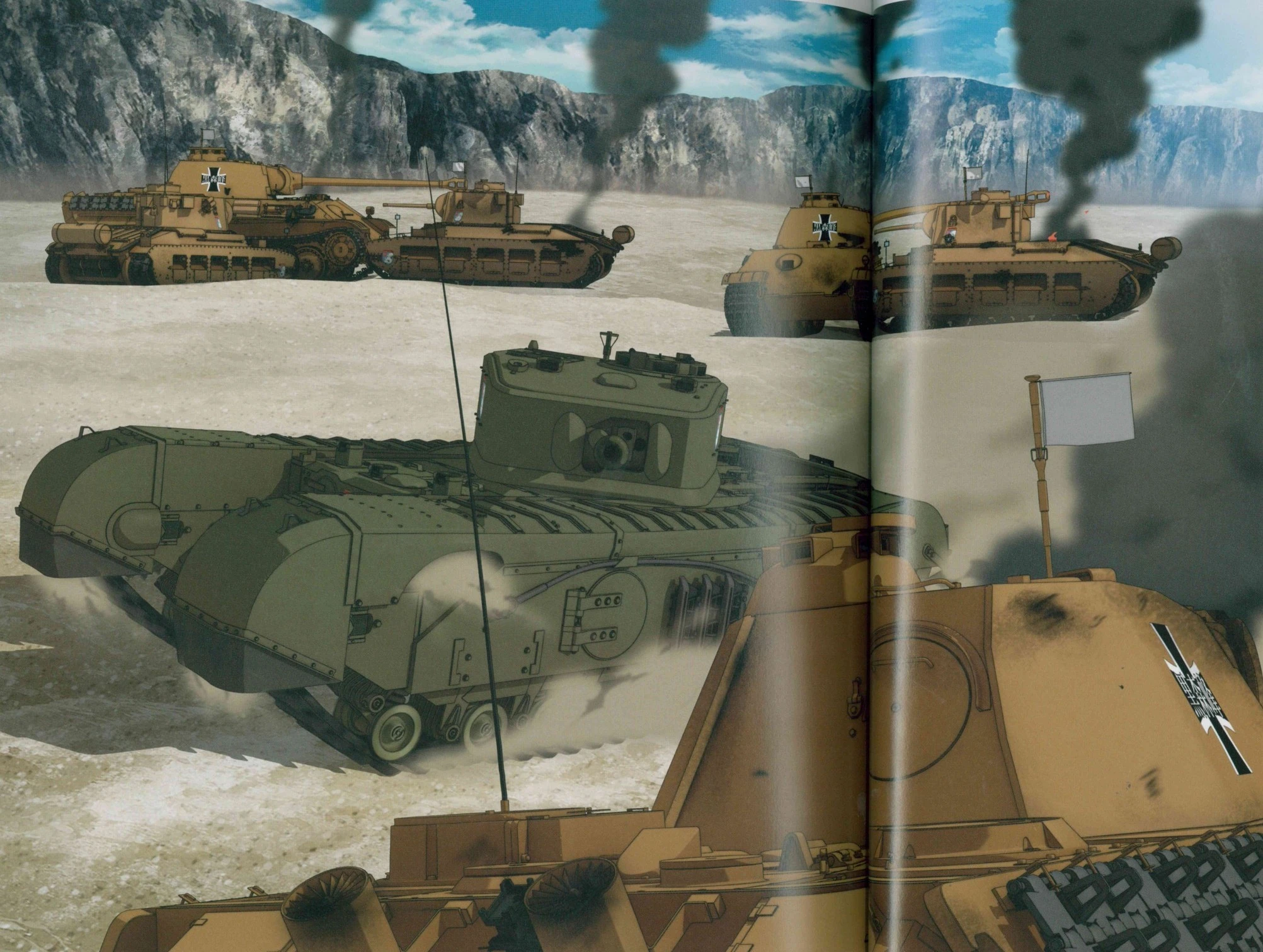 A Kuromorimine flanking group composed of Panthers stormed St. Gloriana's right flank. Darjeeling ordered her tanks to act as a bait and pin down enemy tanks as long as possible and kept her Churchill away from battle. After some fierce fighting the flanking force was completely annihilated and the rest of Kuromorimine's tanks were kept busy by St. Gloriana tanks while their Captain sneaked up the hill to the enemy's flag tank.