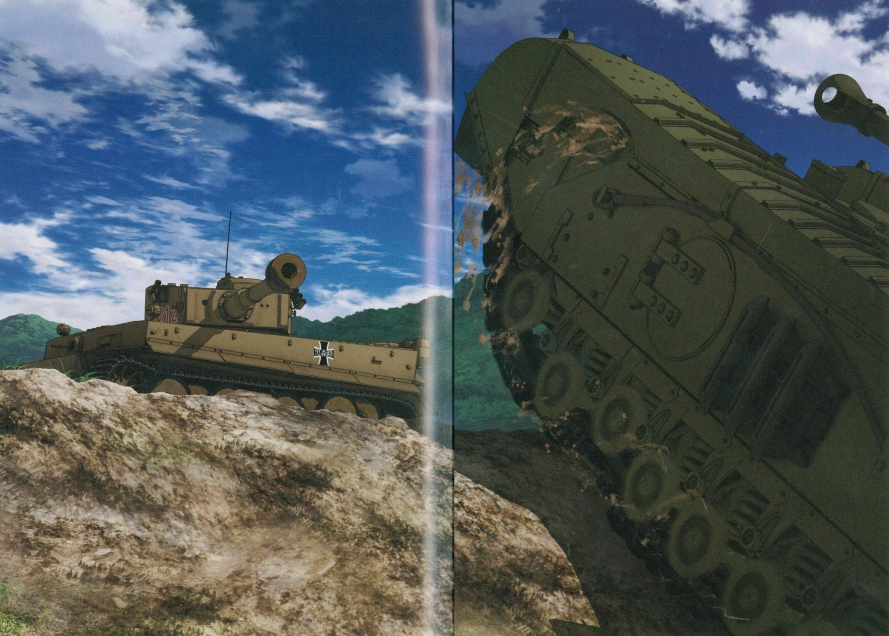 Darjeeling used her Churchill's exceptional climbing ability to crest the ridge line to arrive behind the Tiger only to find out the 88mm cannon staring at her, fortunately a combination of both quick thinking and excellent driving resulted in the shot bouncing off the tank's mantlet. It's now a battle between loaders, Maho boasted that her loader could reload in six seconds, but Orange Pekoe loaded her last round much faster than her counterpart. Assam fired, but she barely missed the Tiger's turret ring, causing the shell to bounce harmlessly off the front armor. After destroying the remnants of the St. Gloriana team, the rest of Kuromorimine's tanks took out the Churchill in a spectacular volley.