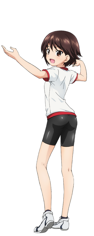 Along with the rest of Ooarai's Senshado team, she was forced to wear the school uniform "properly" by the Public Morals Committee in the 6th chapter of Motto Love Love Sakusen Desu, however, she still wore her Volleyball uniform underneath it. Due to her hair already being short and having a "normal" color, she was not forced to dye it, braid it or have it modified in any other way.