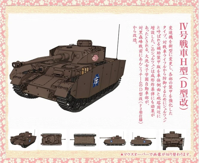 - In the translated official Girls und Panzer website, the Panzer IV is named as Type IV Tank D while the upgrades were described as Type IV Tank F2 (D Type modified) and Type IV Tank H (Modified D Type).