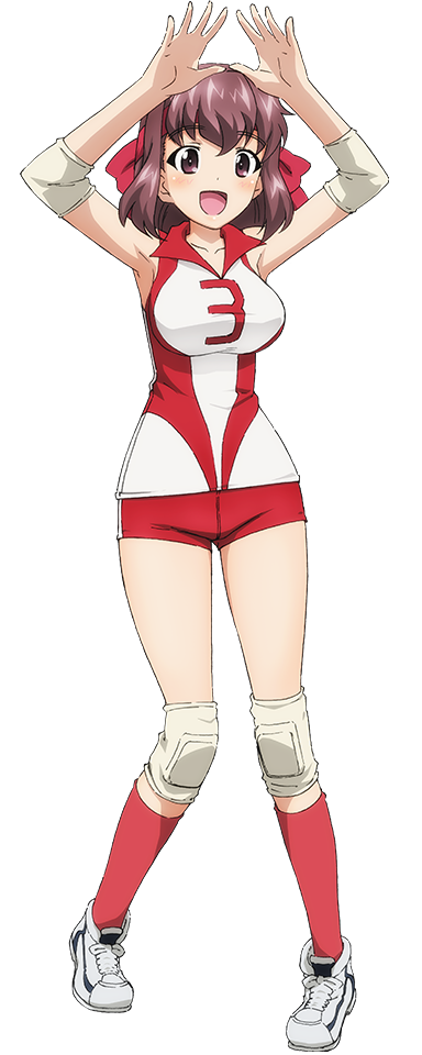 Taeko is a tall and well endowed girl with medium pink-ish brown hair and a pair of brown eyes. She wears the school's Volleyball uniform (#3) and also around her head wear red bandanna tide up into ribbon on back of head. She also have protectors on a knees.
