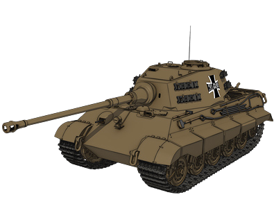 Kuromorimine Girls' Academy operated some Tiger IIs (recognizable as the model produced from June to September 1944 by the nine sprocket teeths and the car jack at the rear). It's effectively used as a long range tank sniper and breakthrough tank, although it easily suffers from high fuel consumption and dislodged road wheels.