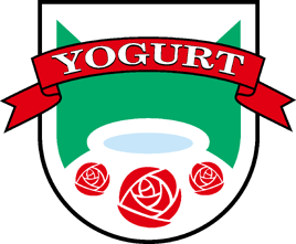 - Yogurt's logo consists of their name "Yogurt" written on a ribbon over a shield with a white and green background. The shield contains images of a yogurt pot and three red roses.